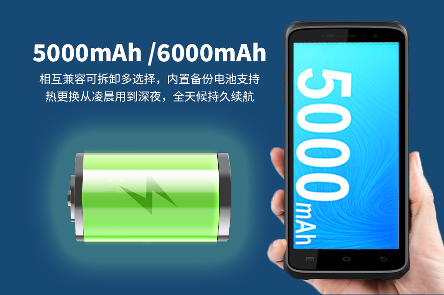 为快递员频繁作业持续使用,我们配备了 6000mAh 大电池,采用 TYPE-C 超级快充方案,根据电池当前充电的状态, 可以智能的输出电压和电流,直接为电池充电,有效的提升了充电的效率。