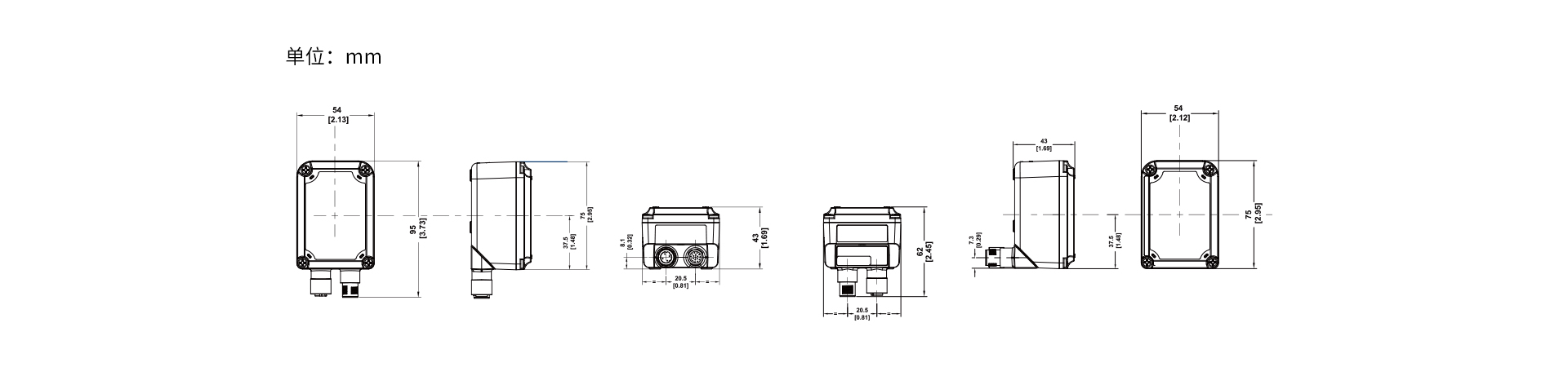 95 x 54 x 43 mm (3.73 x 2.13 x 1.69 in) Connector @ 0° 75 x 54 x 62 mm (2.95 x 2.12 x 2.45 in) Connector @ 90° |