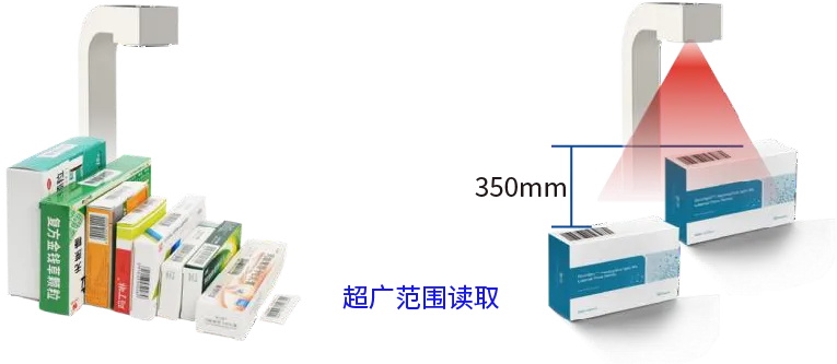 超广读取范围,最大支持 350mm 超广范围条码读取。