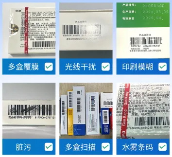 Smart Grid 深度解码算法医药场景定向优化,可准确识读药盒覆膜干扰、反光干扰、脏污遮挡、印刷模糊、水雾、多码读取等复杂药监码读取场景,保障高效稳定识别。